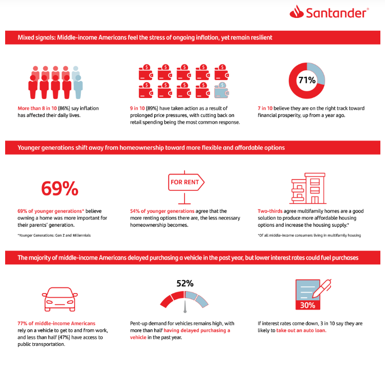 Santander Holdings USA, Inc. (“Santander US”) today announced new findings from a survey that shows while middle-income Americans remain optimistic about their financial futures, they continue to navigate inflationary pressures and recession concerns. More consumers (81%) consider inflation a major concern in Q3, and 86% say it has impacted their daily lives. Despite this trend, consumers remain resilient. Most middle-income Americans (76%) say they have remained current on their bills, and more of them (71%) say they are on the right track toward financial prosperity than a year ago.