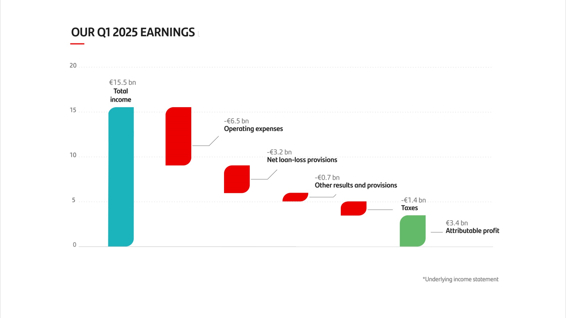 That 19% growth is favoured by the temporary levy on revenue earned in Spain (€335 million) which was fully recorded in the first quarter of 2024. This figure contrasts with €87 million recorded in the first quarter of 2025, representing the quarterly accrual of the tax on revenue expected in Spain for the year. Had the bank accrued the 2024 temporary levy by distributing the charge evenly across the four quarters, consistent with the 2025 tax treatment, the profit for the first quarter would have increased by 10%.