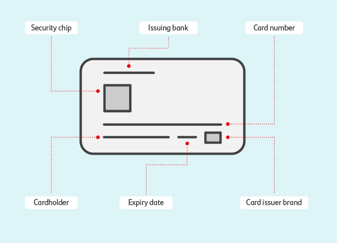 The front of the credit card shows the name of the bank; a security chip; the bank identification number (BIN, or “card number”), which usually contains 16 digits; the card expiry date; and the cardholder’s name. At the bottom is the name of the card issuer (e.g, Visa, Mastercard and American Express) (see the image below):