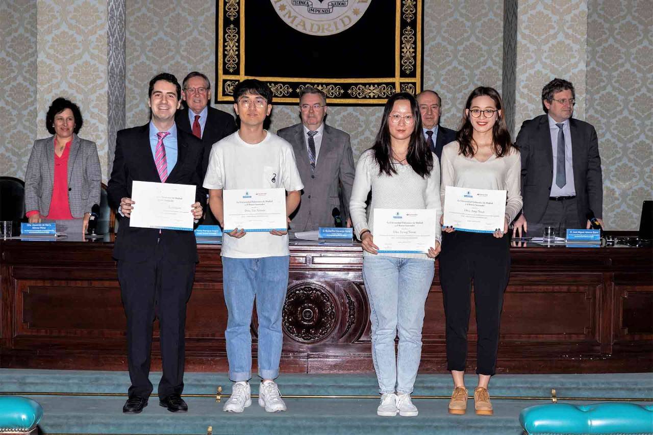 El acto ha sido presidido por rector de la UPM, Guillermo Cisneros y el presidente de Santander Universidades, Matías Rodríguez Inciarte; acompañados por el presidente del Consejo Social UPM, Julio Lage; la vicerrectora de Investigación, Innovación y Doctorado, Asunción Gómez y el vicerrector de Estrategia Académica e Internacionalización, José Miguel Atienza.