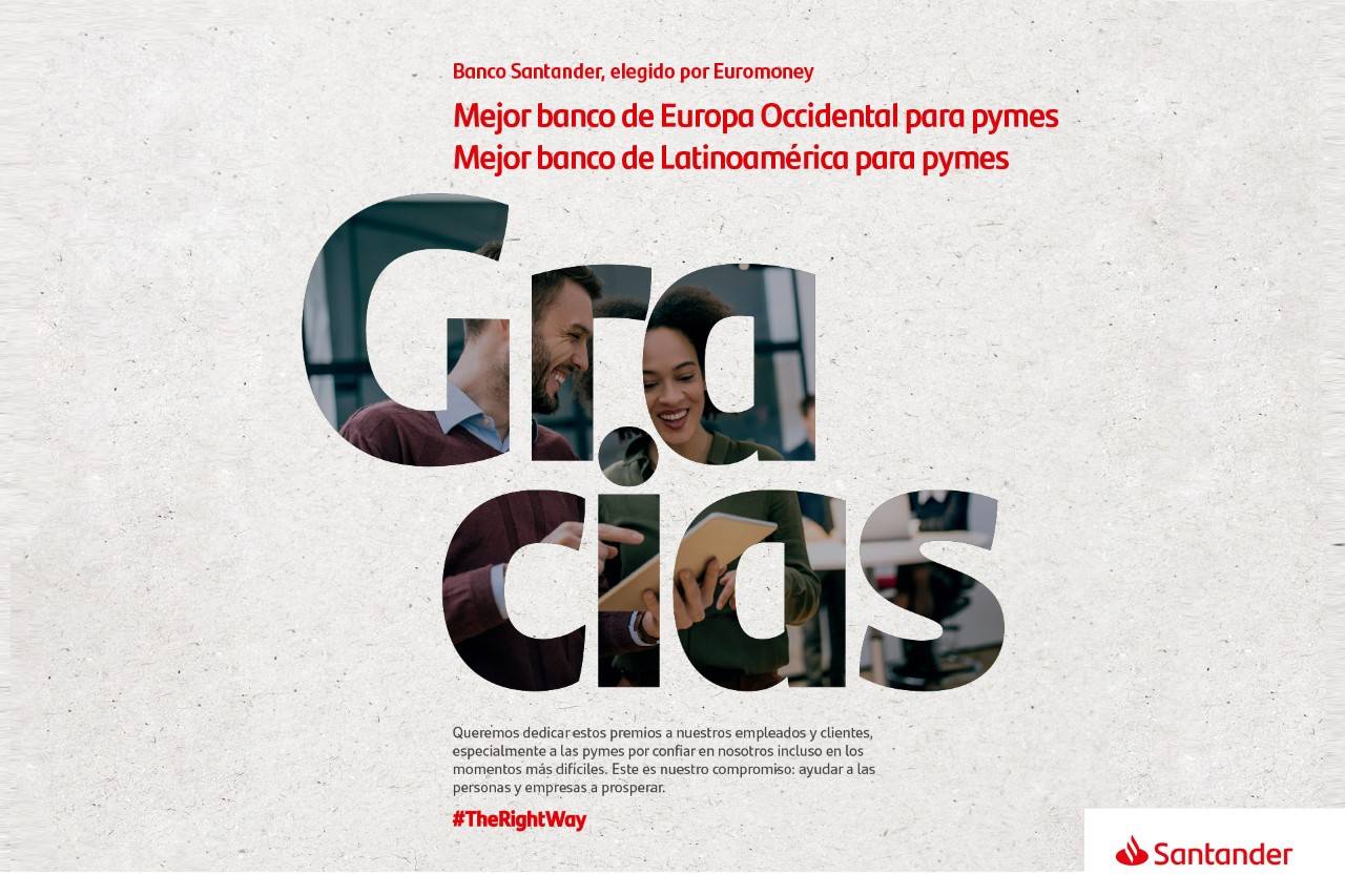 Euromoney también ha valorado el apoyo que Banco Santander está dando a las pymes durante la crisis, con el premio a mejor banco para las pymes en Europa Occidental y Latinoamérica. Santander también ha obtenido los premios a mejor banco de España y Portugal, y mejor banco de inversión de Portugal.