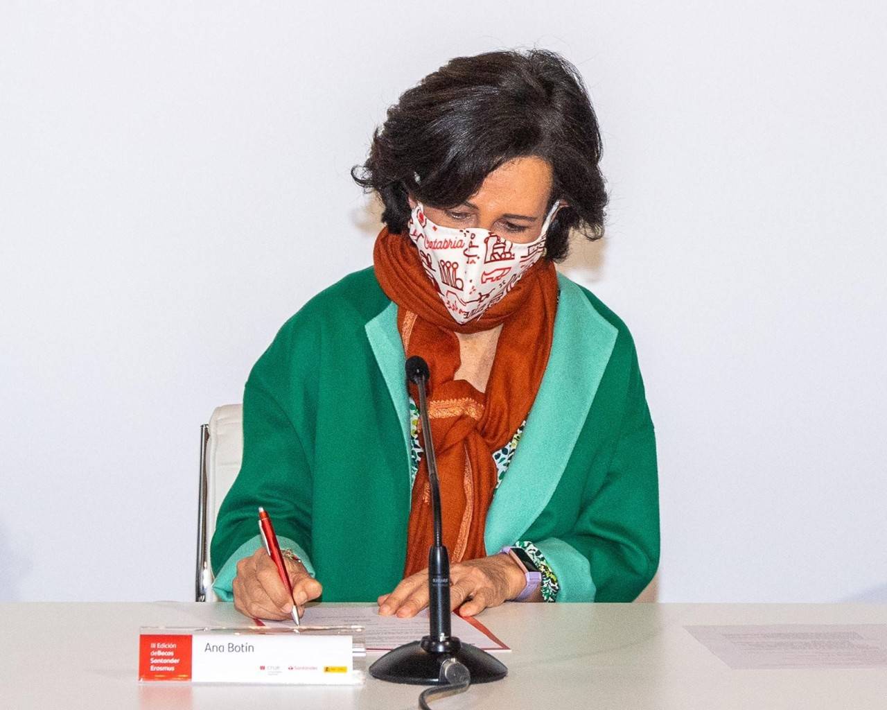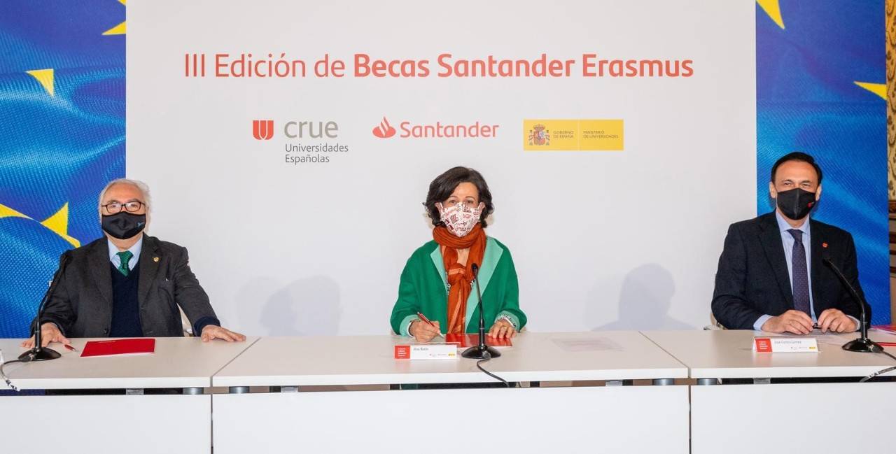 El Ministro Manuel Castells, la presidenta de Santander Ana Botín y el presidente de Crue Universidades Españolas, José Carlos Gómez Villamandos, también han sellado esta mañana su colaboración para el desarrollo de la tercera edición de las Becas Santander Erasmus 2021/2022, cuyo objetivo principal impulsar el progreso académico de los estudiantes a través de la internacionalización, promoviendo la igualdad de oportunidades, la inclusión y el reconocimiento de la excelencia académica de los jóvenes.