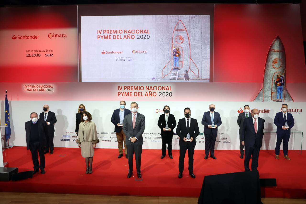 “A pesar de tanta dificultad, todo el esfuerzo, tantos ejemplos como estos de vuestra voluntad y determinación, han permitido mantener un hilo de esperanza”. Así se ha referido Su Majestad el Rey a las pequeñas y medianas empresas españolas durante su intervención en la Final Nacional del Premio Pyme del Año 2020, un galardón que otorgan la Cámara de Comercio de España y el Banco Santander.