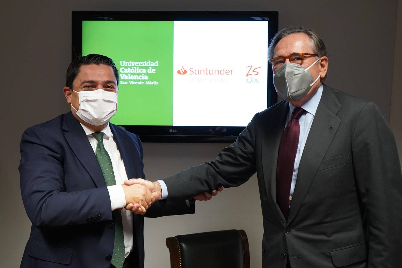 El rector de la Universidad de Valencia (UCV), José Manuel Pagán, y el presidente de Santander Universidades, Matías Rodríguez Inciarte, han renovado esta mañana el acuerdo de colaboración que ambas instituciones mantienen para desarrollar distintos programas académicos que impulsen el talento y ofrezcan oportunidades a la comunidad universitaria para fomentar la internacionalización, la excelencia, la equidad y la inclusión.