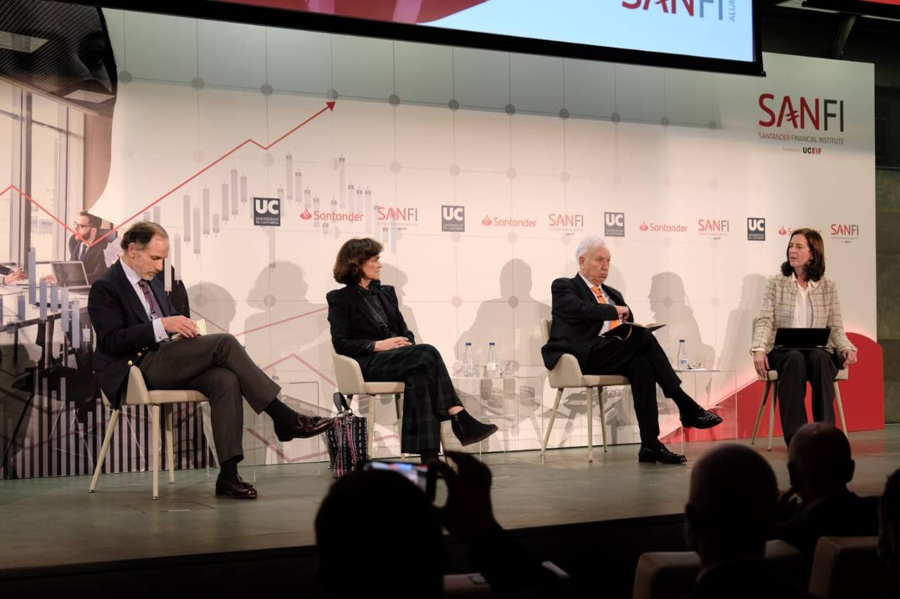 El coloquio, dirigido por la directora del Servicio de Estudios, Public Policy y Relaciones Institucionales de Banco Santander y recientemente propuesta para presidenta de la Asociación Española de Banca (AEB), Alejandra Kindelán, también contó con la participación de la exvicepresidenta del Gobierno, Carmen Calvo y el secretario general y del consejo de Banco Santander, Jaime Pérez Renovales.
