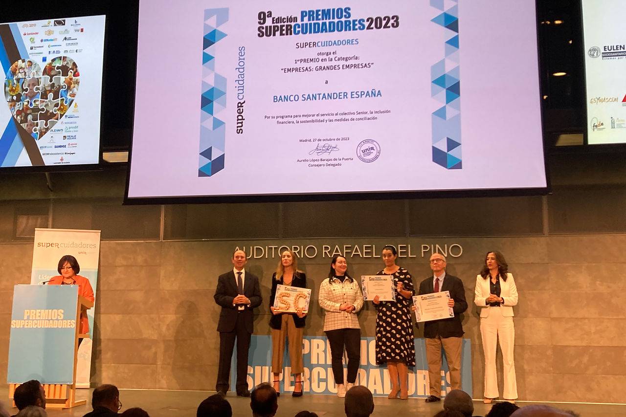 Santander España ha recibido el premio Supercuidadores 2023, impulsado por la Universidad Internacional de La Rioja (UNIR) en la categoría de grandes empresas; unos premios que se convocan desde hace nueve años para reconocer la labor, tanto de las personas físicas como de las personas jurídicas, por su trabajo y acciones para mejorar la calidad de vida de personas mayores, personas que sufran algún tipo de enfermedad o se encuentren en situación de discapacidad y/o dependencia.