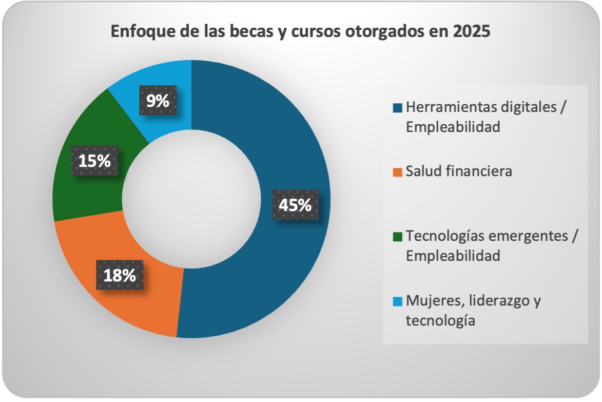 En cuanto a las áreas de formación, las principales temáticas de las becas y cursos otorgados en 2025 estuvieron enfocadas en herramientas digitales y empleabilidad (45%), salud financiera (18%), tecnologías emergentes vinculadas a la empleabilidad (15%), así como programas dirigidos a mujeres, liderazgo y tecnología (9%), prioridades que responden a los retos actuales del entorno económico y laboral.