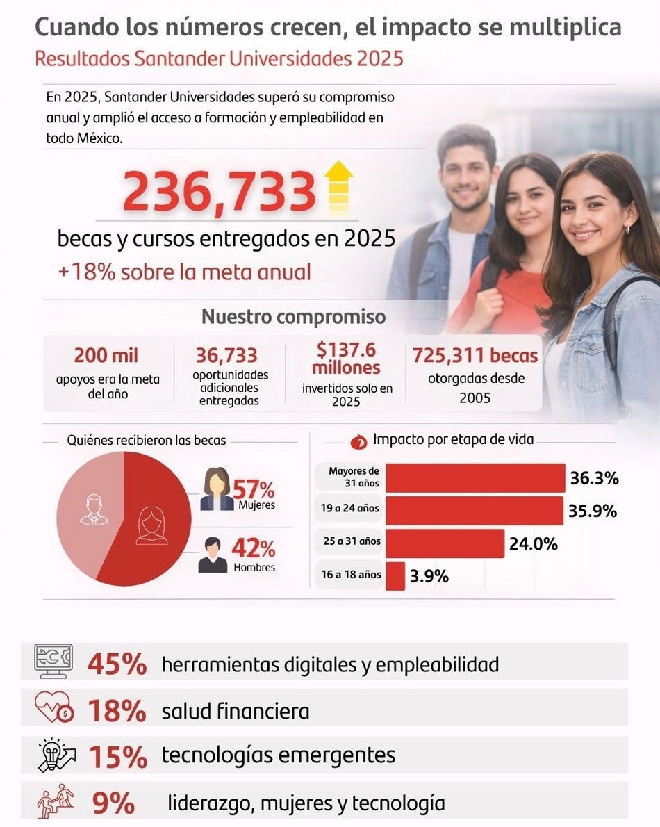Banco Santander México, a través de Santander Universidades, presentó los resultados 2025 de su estrategia de impulso a la educación, la formación continua y la empleabilidad, con la entrega de 236,733 becas y cursos en todo el país, cifra que supera en 18% el compromiso anunciado a inicios de año de otorgar 200 mil apoyos, la meta anual más alta en la historia de la institución.