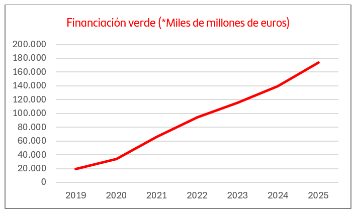 La entidad ha movilizado 174.000 millones de euros en financiación verde entre 2019 y 2025, un 79% de la meta fijada para 2030.